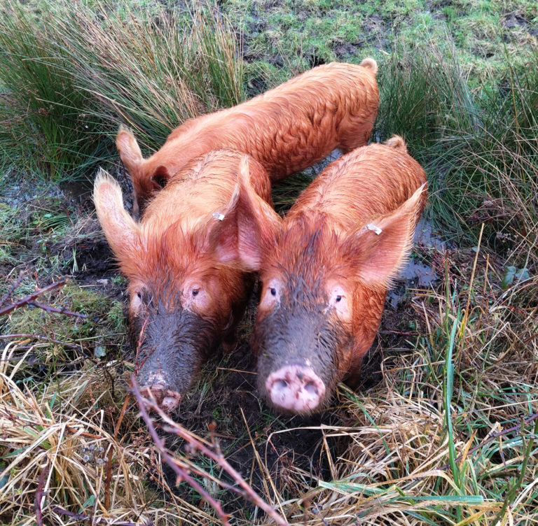 We have selected native breeds which are well adapted to lives outdoors and in natural spaces to work to achieve the goals of landlords. Our Tamworth pigs are selected as they are considered the closest to wild pigs. So they have successfully been tackling bracken dominance on nature reserves and playing a part in Cornwall’s largest rewilding project. They have created ephemeral pools, bare ground for wildflowers to germinate and lessened the extent of rush monocultures.